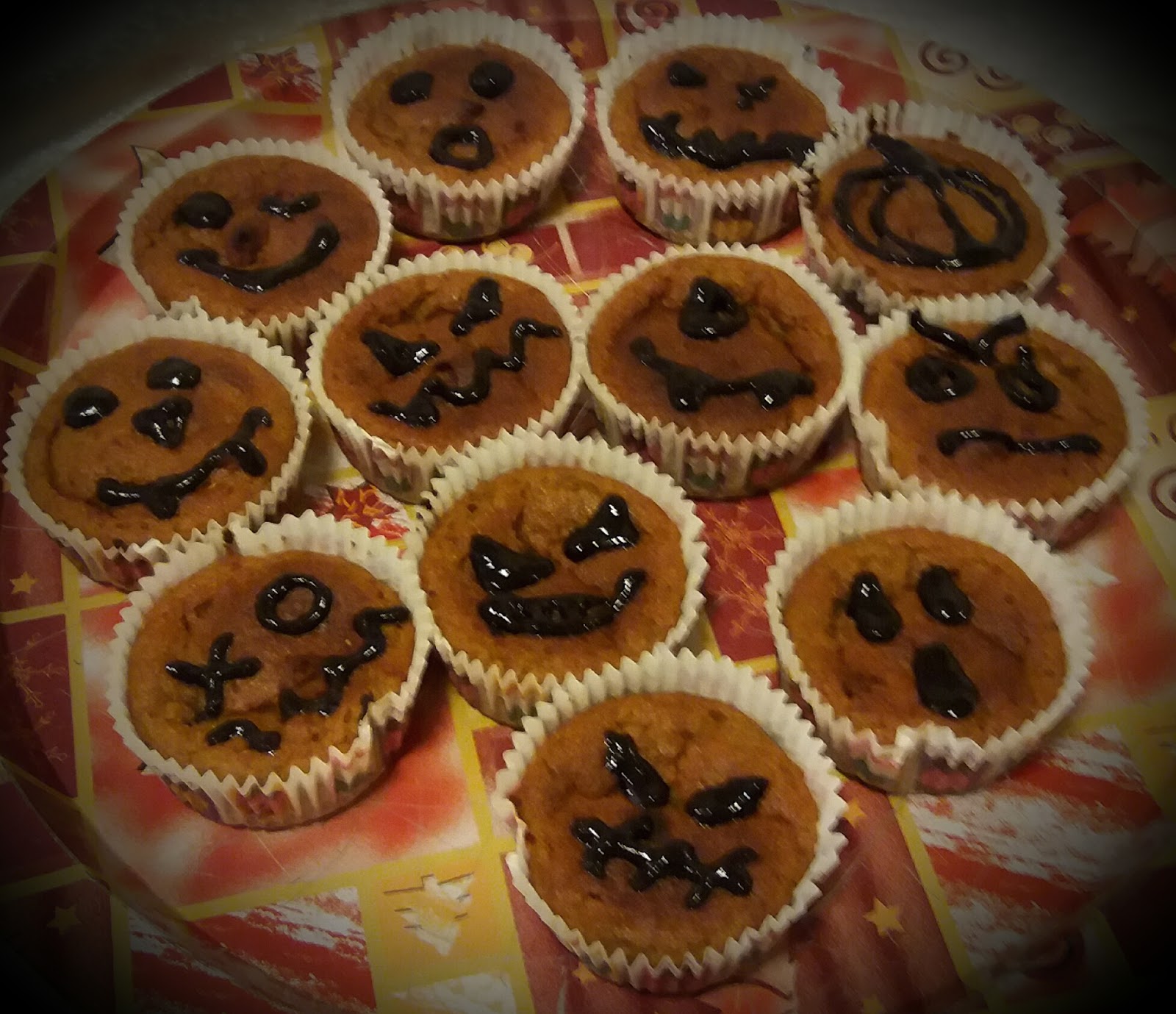 Тази година до картичка на тема Хелоуин не стигнах, но пък спретнах едни тиквени мъфини със страшни лица.